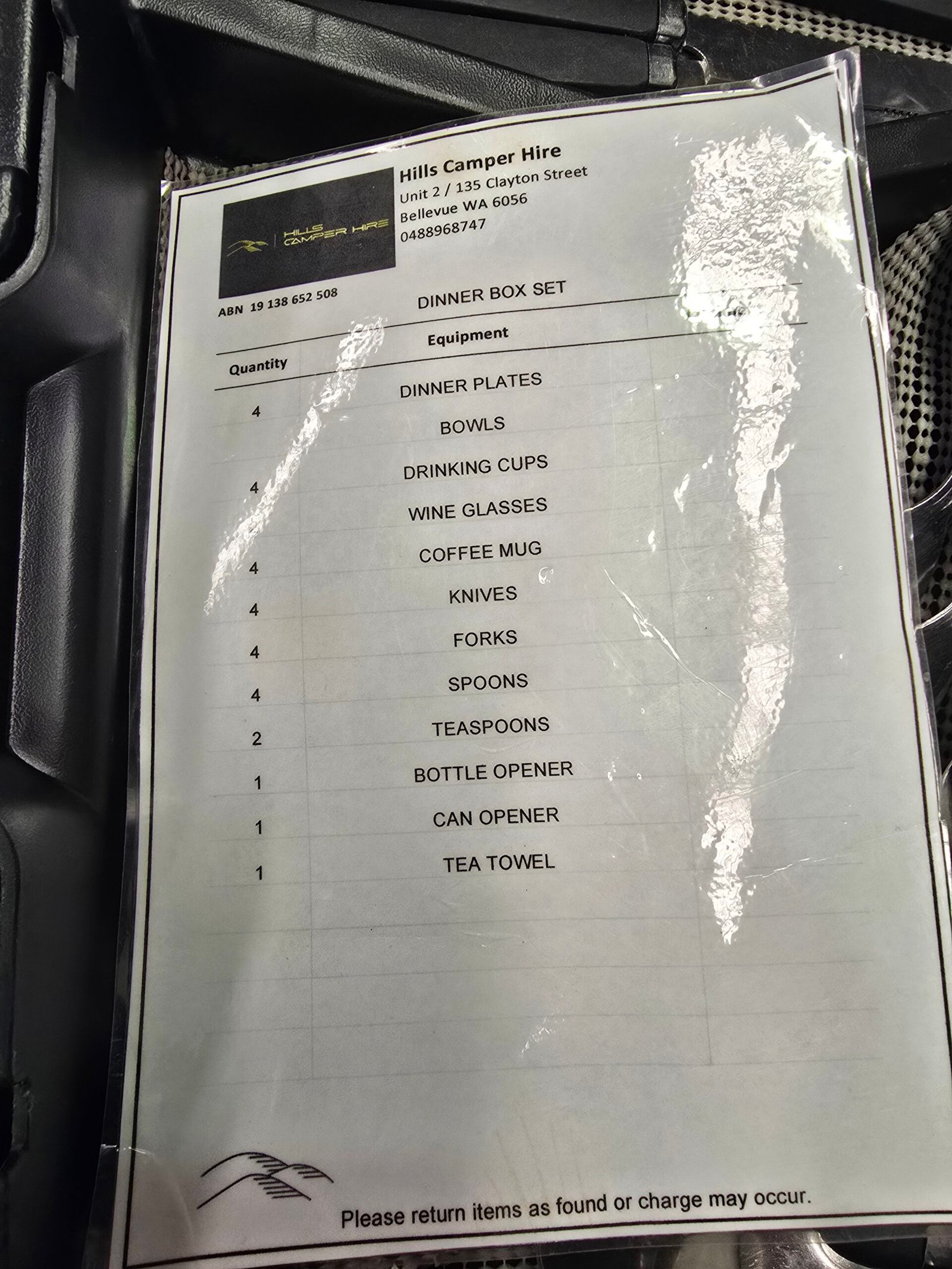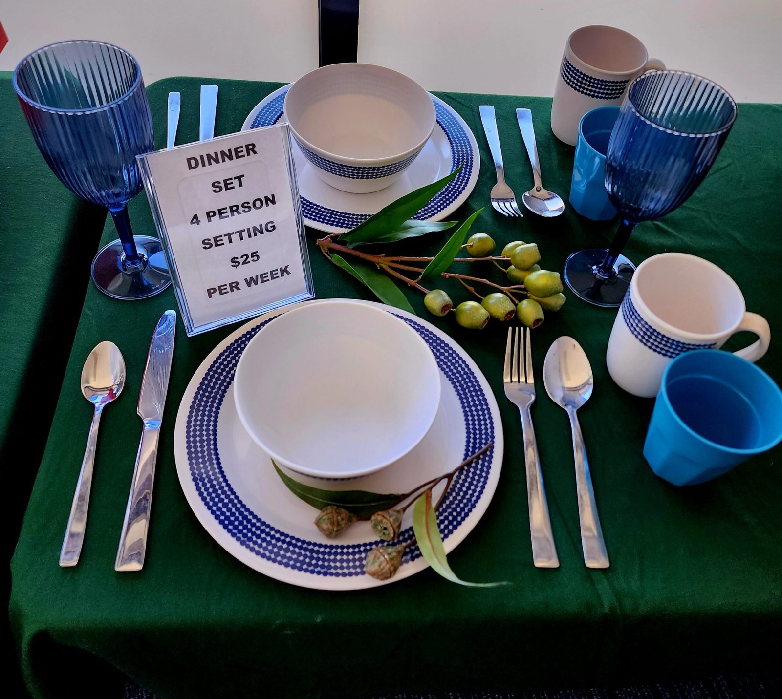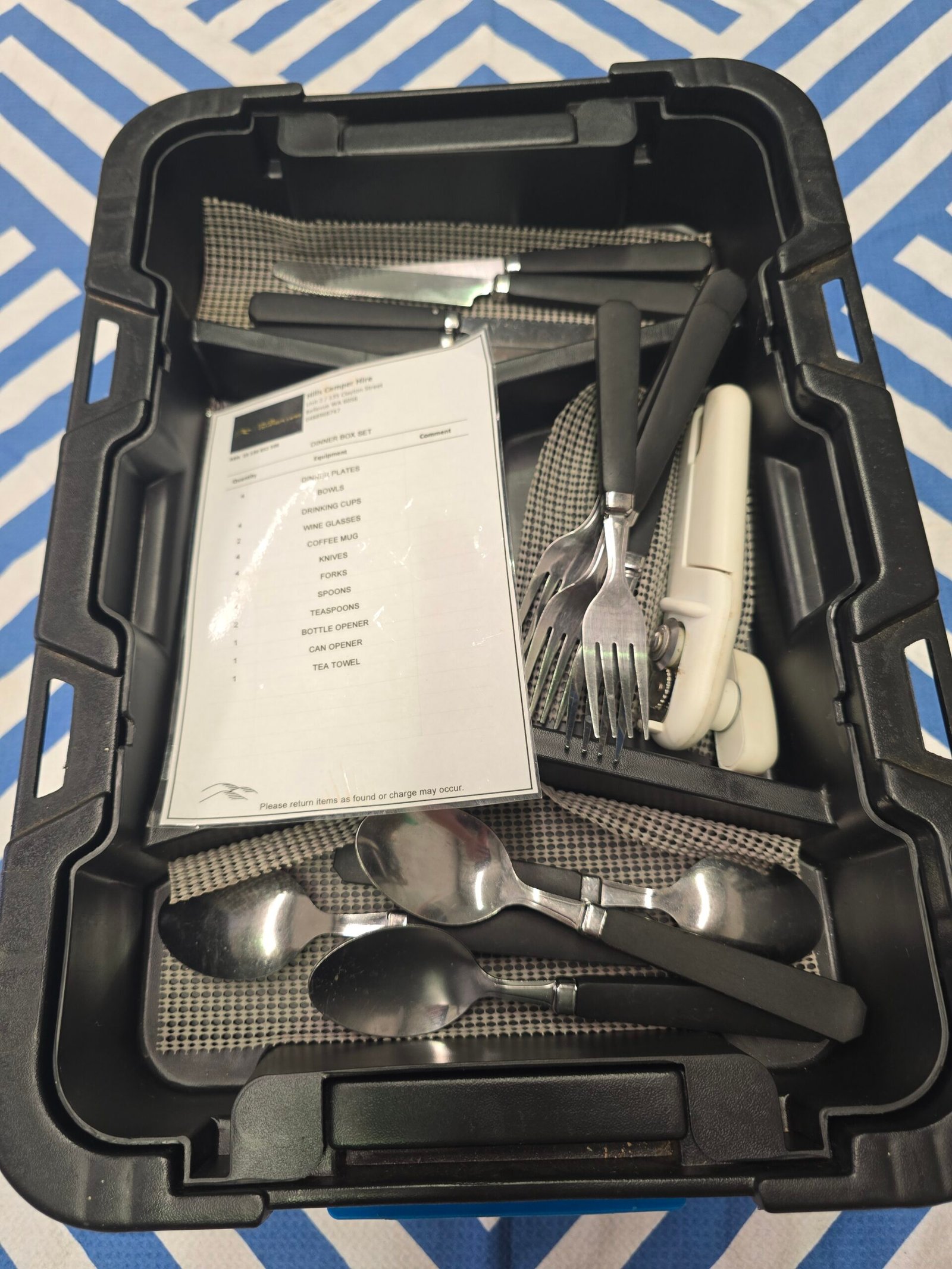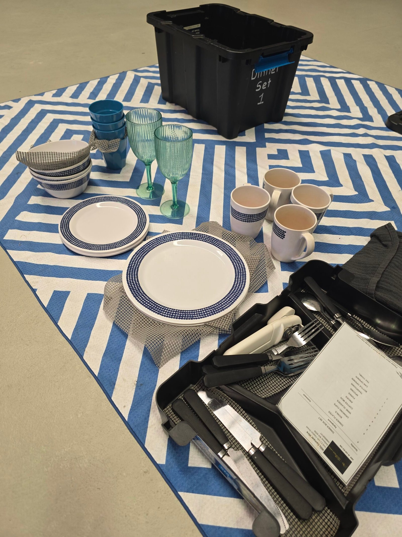 Dont want to take you kitchen items camping? Use ours! Hire our dining set for four people.